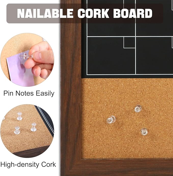 - 【Chalkboard combines Corkboard】Perfect combination meets all your requirements. Our chalkboard uses high-quality porcelain steel, and the corkboard is made of high-density cork, which allows you to pin notes, to-do lists, photos and plans on the chalkboard calendar with 10 pushpins we send. The durable premium blackboard and thick frame can withstand constant writing and erasing without falling apart.