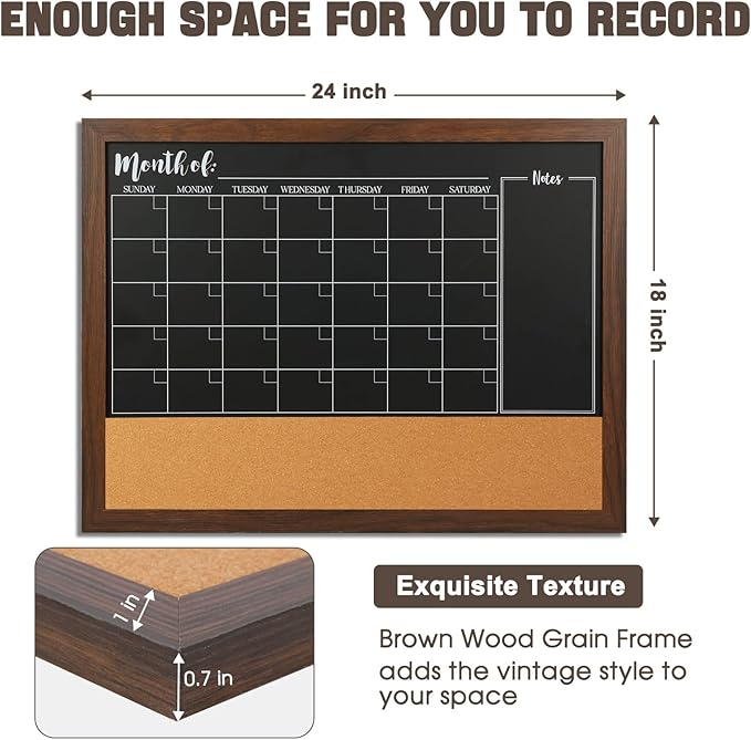 - 【Ideal Size & Rustic Design】4 THOUGHT chalkboard calendar and cork board combo are designed with brown vintage frame, adding a touch of rustic beauty to your home, office and shop. This calendar combination board will match various decor styles. 18 x 24 in size is ideal for you to write something and pin any messages.