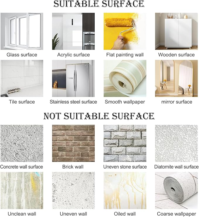 - Peel and Stick Easily: It can be stuck to any smooth surfaces, walls, furniture, tiles, mirrors and windows, reusable without leaving damage or residu
