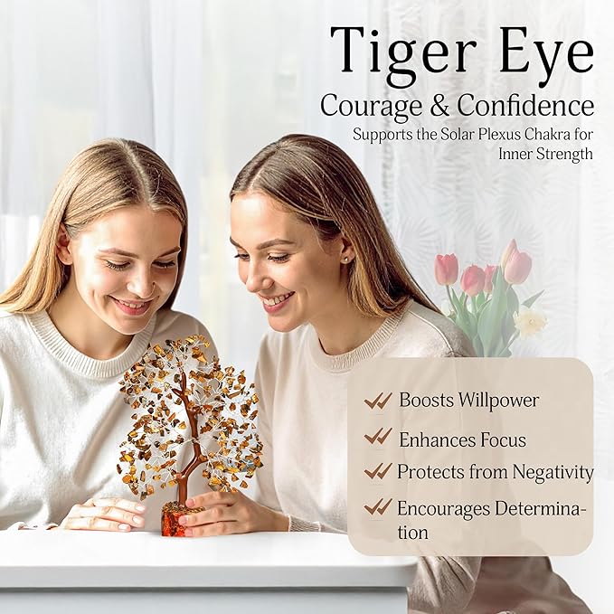 - Chakra Tree Of Life - Tiger eye feng shui bonsai tree is for those who need some help with their lower chakra, the Tiger's eye crystal makes for a comforting companion. The root, solar plexus & the sacral chakra all work in harmony with this earthly stone. these are the safety and strength chakras where people feel grounded, connected to the earth and stable enough in this world to leap higher and explore deeper level of spiritual consciousness