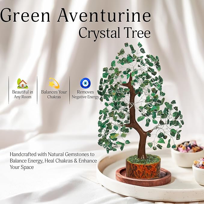 - Green aventurine crystal tree - a wonderful chakra healing masterpiece from the coasts of india. From a crystal gemstone to the final product, with pure craftsmanship, this reiki crystal tree is filled with healing energy. Symbolizing like a blooming tree, this feng shui bonsai figurine's branches are beaded amidst natural green aventurine chakra stones. Base of this home decorative item is made from wood. The trunk & branches are built from silver wires, making approximately 10-12 inch tall