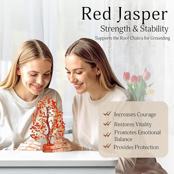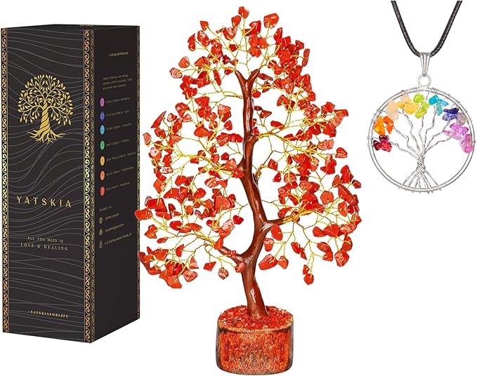 - Red jasper crystal tree of life - With firm packaging, the box includes an astonishing red jasper crystal tree and a pair of seven chakra healing pendant necklaces (pair includes seven chakra tree of life necklace & seven chakra orgone pendant). As the branches and the trunk of this Buddhist figurine are flexible, the gemstone money tree comes folded due to packaging reasons. You need to unravel the crystal tree upon receiving.