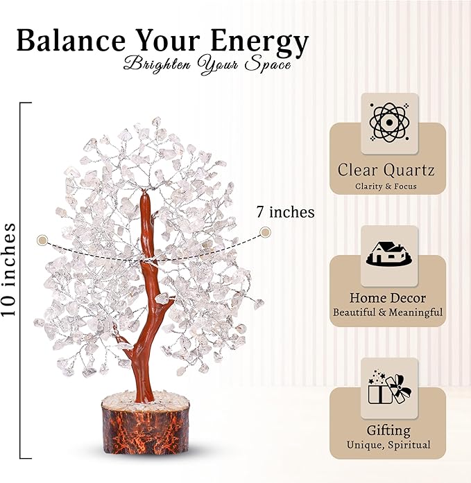- Premium Clear Quartz Gemstone - This is a 100% handmade Indian tree with natural Clear Quartz Gemstones. We put all our effort so that this tree can provide you with all the healing benefits of the stone. Because of handcrafting there may be slight deviation in some of the trees you recieve. As each of the stones are inserted into the wires through handcrafting sometimes there might be increase stone quanitity in your tree. Also feel free to contact us if your want to customize your tree!