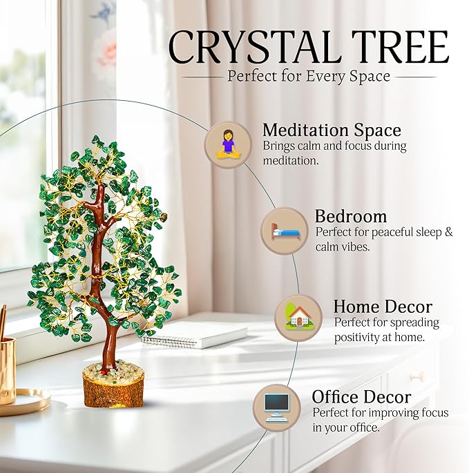 - REIKI CHAKRA HEALING WITH DIVINE TREE- With the colors of green, the green aventurine crystal tree is all about healing the heart chakra. The Green Aventurine Crystal present on this feng shui Buddhist figurine is known as the “Stone of Opportunity". Reiki divine tree brings well-being and calmness. The presence of this crystal money tree in your living or workspace will encourage compassionate behavior, self-love & will enhance self-confidence.