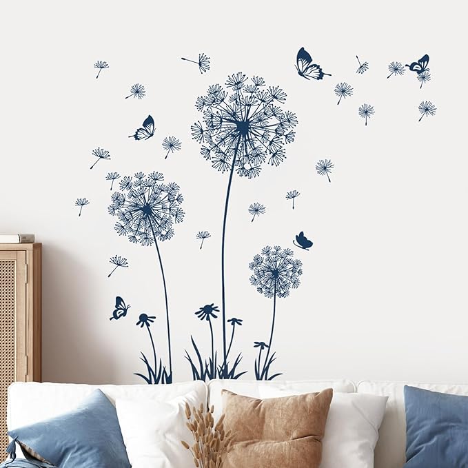 2 Sheets Dandelion Wildflower Wall Decals Art, Calcomanías para Pared Peel and Stick Floral Butterflies Flying Decor for Girls Kids Women Baby Nursery Bedroom Bathroom Sofa Backdrop TV Wall (Blue)