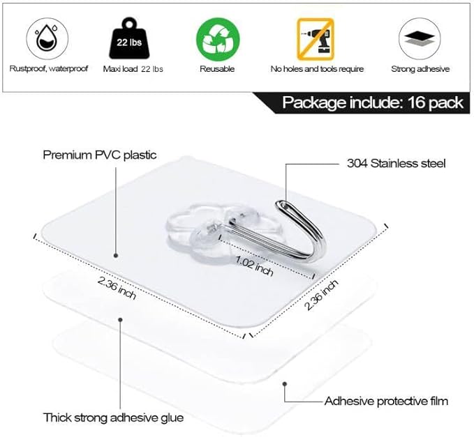 - Stainless Steel Self Adhesive Hooks - No drill wall hooks: 16 small stick on hooks in one pack, the wall hooks for hanging are made of stainless steel and plastic material,rustproof,waterproof, oilproof and strong durable. Adhesive hooks for hanging can be used in, kitchen cabinet,closet, bathroom inside shower wall, window, mirror,behind door, outdoor,classroom,dorm etc.