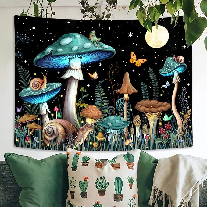 Zussun Teal Mushroom Tapestry Moon Star Tapestries for Bedroom Aesthetic Starry Night Green Plant Tapastrys Wall Hanging Butterfly Snail Frog Wall Tapestry for Living Room Dorm (Green, 48" x 36")