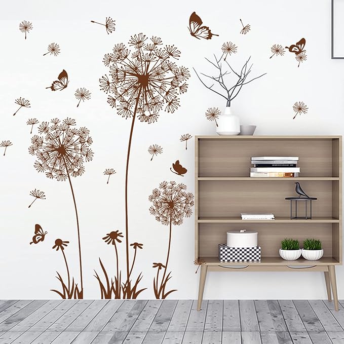 2 Sheets Dandelion Wildflower Wall Decals Art, Wall Art Stickers Peel and Stick Floral Butterflies Flying Decor for Girls Kids Women Baby Nursery Living Room Bedroom Bathroom Hallway Stairwell (Brown)