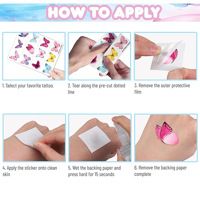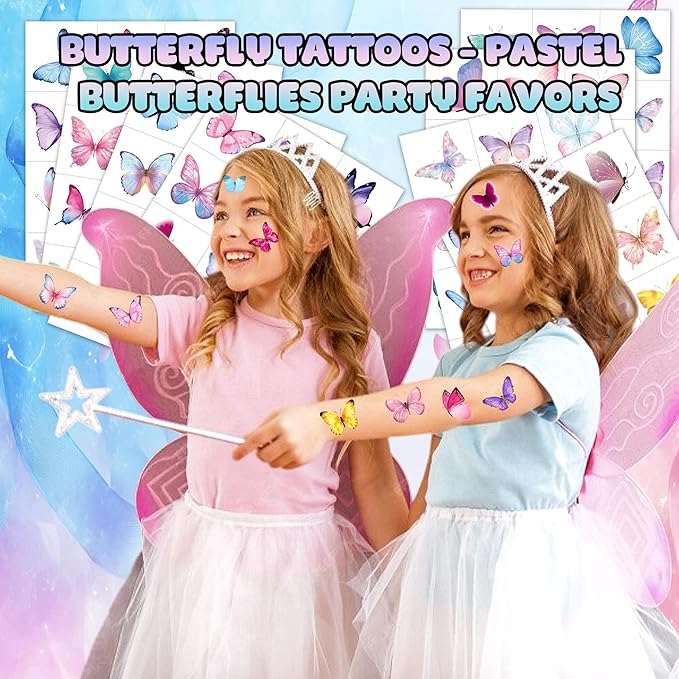 - BUTTERFLY BIRTHDAY PARTY: Colorful BUTTERFLY tattoos mixed with natural flowers will take you lost in BUTTERFLY paradise.Sure enough to believe that you will have fun a lot when playing with our tattoo stickers. The tattoo is the best gift for a birthday party together with the important meaning that it says ^^