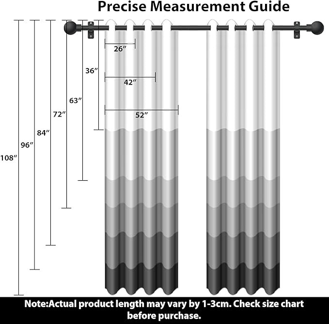 - [PACKAGE CONTENTS]: 2 abstract panels printed window curtain in package. Each panel measures 52 "W x 63 "L (132x160cm)/52 "W x 84 "L (132x213cm)/52 "W x 96 "L(132x244cm). Each panel has 8 silver metal grommets, inner diameter of grommet is 1.6(4cm)inch , fit well with standard or decorative curtain rods.
