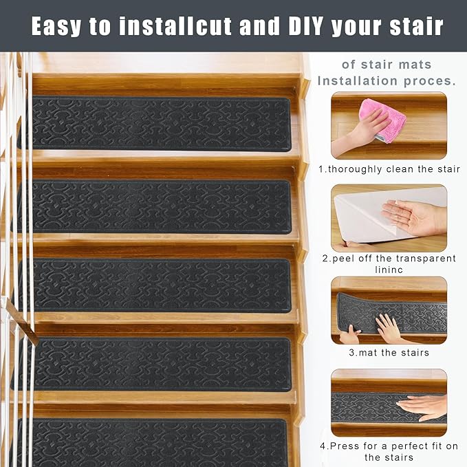 - EASY INSTALLATION: Effortlessly install our non-slip stair treads by placing them on your staircase and pressing them down. No adhesive or complex tools required—just stick them on and enjoy immediate protection.