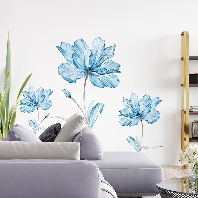 Zonon 6 Pcs Flowers Wall Decals Stickers Vinyl Removable Peel and Stick Colorful Dragonflies Floral Wall Murals Decor for Bedroom Living Room Nursery(Blue Flower)