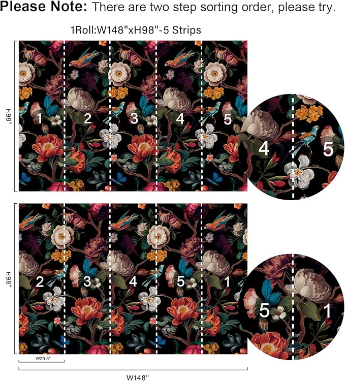 - 1 Roll Wall Mural: 148"W x 98"H (Covers 101 sq. ft. ). This floral wallpaper mural is cut into 5 strips for easy installation. Measure your wall and buy enough rolls