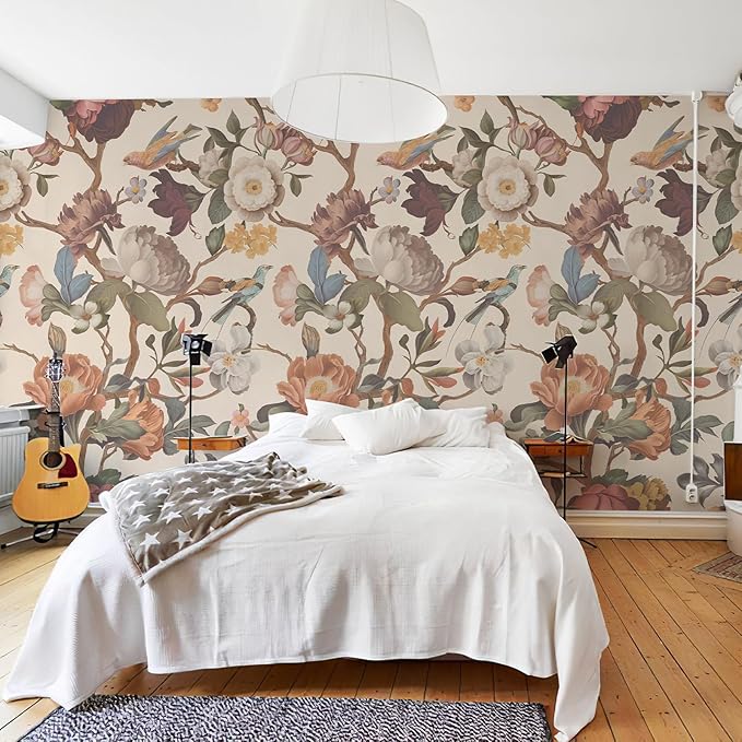 Zeeko Floral Peel and Stick Wall Mural Beige Flower Wallpaper for Bedroom TV Background Vintage Wallpaper Large Floral Wall Murals Art Deco 148" W x 98" H