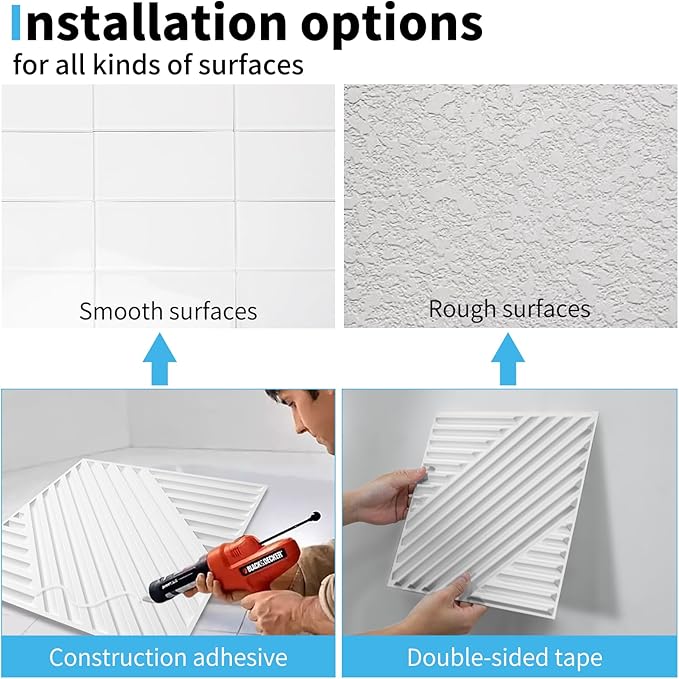 - User-Friendly Installation - The panels are lightweight and simple to maneuver, allowing for easy installation using common household tools such as measuring tape, level and standard adhesive or double-sided tape, no need for special tools or skills
