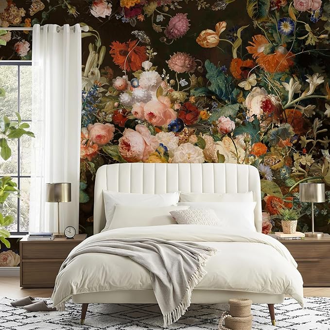 Zeeko Dark Floral Wallpaper Peel and Stick 148" W x 98" H Waterproof Canvas Fabric Vintage Moody Large Wall Mural Self Adhesive Removable Wall Paper for Bedroom Living Room Art Deco