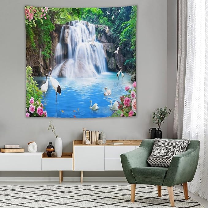 ZhiRain Waterfall Landscape Tapestry Wall Hanging Natural Forest Garden Trees And Roses Flower Scenery Tapestries Home Decor for Living Room Bedroom Apartment Farmhouse Dorm 60"x60"