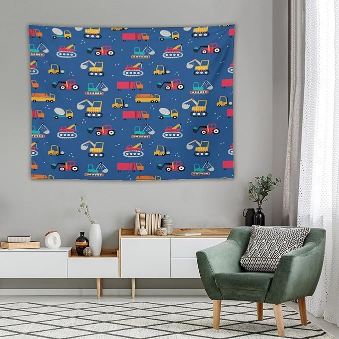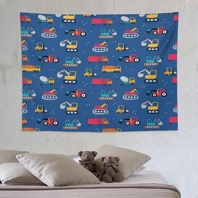 ZhiRain Cartoon Cars Print Tapestry Wall Hanging for Kids Room Cartoon Shovel And Trucks Blue Tapestries Home Decor for Living Room Bedroom Apartment Farmhouse Dorm 60"x80"