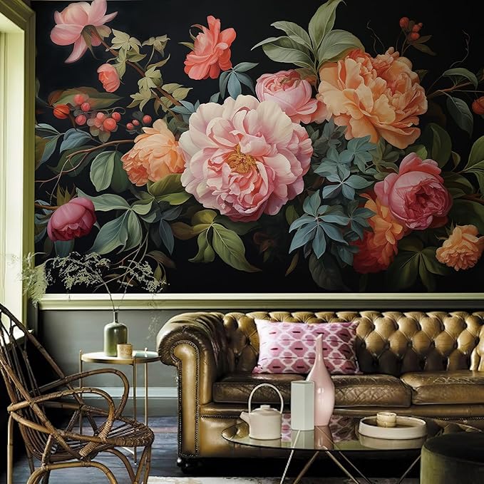Zeeko Large Floral Peel and Stick Wall Murals 148" W x 98" H Vintage 3D Dark Peony Flowers Wallpaper Self Adhesive Nature Botanical Leaf Wall Stickers for Bedroom TV Background Living Room Decor