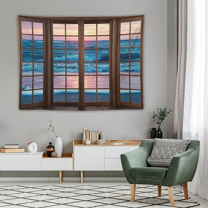 ZhiRain Landscape Tapestry Wall Hanging Beach Sand Ocean Waves Seaside Brown Window View Tapestries Home Decor for Living Room Bedroom Apartment Farmhouse Dorm 60"x80"