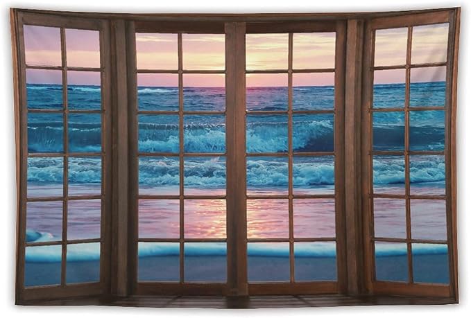 ZhiRain Landscape Tapestry Wall Hanging Beach Sand Ocean Waves Seaside Brown Window View Tapestries Home Decor for Living Room Bedroom Apartment Farmhouse Dorm 60"x90"