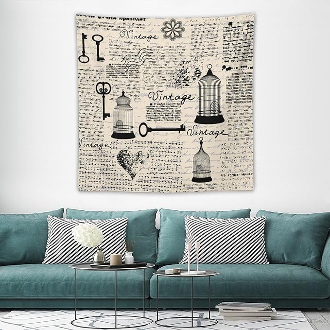 ZhiRain Old Newspaper Tapestry Wall Hanging Bird Cages Grunge Retro Pattern Keys Heart Shapes And Flower Tapestries Home Decor for Living Room Bedroom Apartment Farmhouse Dorm 60"x60"