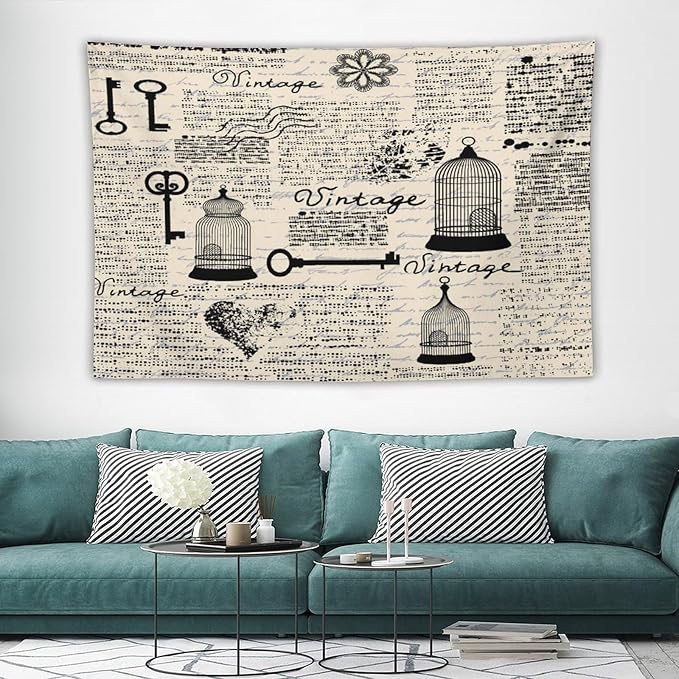 ZhiRain Old Newspaper Tapestry Wall Hanging Bird Cages Grunge Retro Pattern Keys Heart Shapes And Flower Tapestries Home Decor for Living Room Bedroom Apartment Farmhouse Dorm 60"x90"