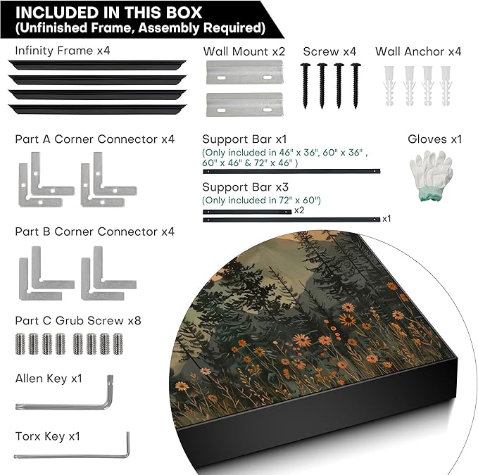 - Assembly Required: The frame print is unfinished frame and assembly required, but don’t worry, it is easy to set up. We recommend two people for an easy, accurate setup, ensuring secure and stable hanging.