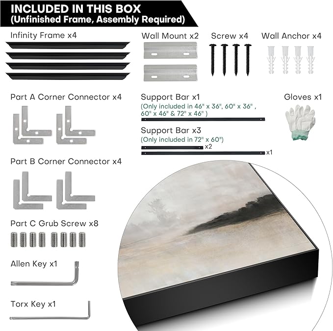 - Assembly Required: The frame print is unfinished frame and assembly required, but don’t worry, it is easy to set up. We recommend two people for an easy, accurate setup, ensuring secure and stable hanging.