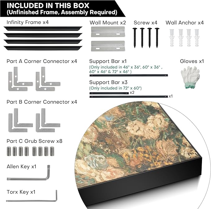 - Assembly Required: The frame print is unfinished frame and assembly required, but don’t worry, it is easy to set up. We recommend two people for an easy, accurate setup, ensuring secure and stable hanging.