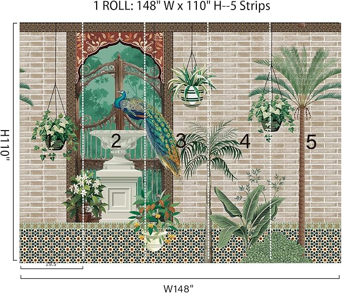 - 1 Roll Exotic Indian Wallpaper Mural:110"H x 148"W (Covers 113 sq. ft. ). This mural wallpaper is cut into 5 strips for easy installation. The deep color tones and natural fabric texture lend a painterly depth to every palm leaf and feather detail.