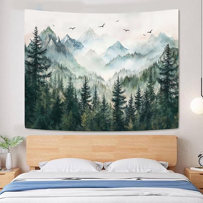 - Breathtaking Forest Mountain Design: Experience the beauty of nature with this nature tapestry wall hanging, showcasing misty pine forests, majestic mountains, and soaring birds in soft watercolor tones, adding tranquility and charm to any room