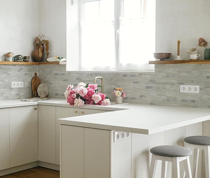 Yipscazo 40 Sheets Peel and Stick Stone Metal Backsplash, PVC Wall Tiles Stick on Tiles for Backsplash Kitchen, Bathroom, Laundry Room, Camper, Fireplace (6'' X 12'', Gray Beige)