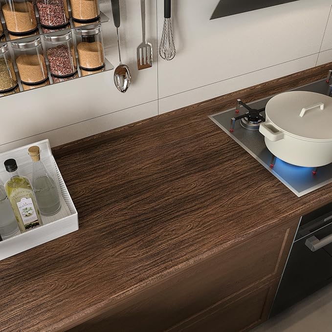 - Applications: Dark wood contact paper ideal for refinishing and decorating kitchen, dining room, bathroom, living room, studio, bedroom, laundries, balconies, garages, storage room, staircase step, entrance, hallway, apartments rental houses, etc. It is very suitable for DIY table, countertops, cupboards, drawers, kitchen islands, washbasin, RVs, filing cabinets, fireplaces, walls, shelves, racks, desk, plank, nightstand, hutch, stools, floors, tiles, backsplashes, storage cabinets, doors, home appliances, etc.