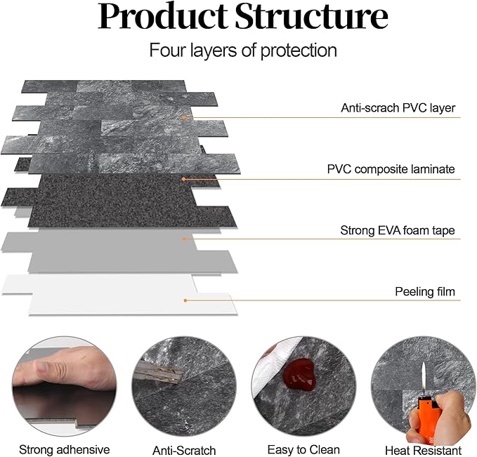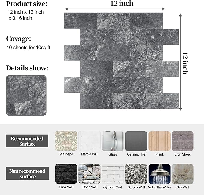 - √Strong resistant - This backsplash tile made of muti layer PVC composite laminate, more thicker than 3D wallpaper or vinyle tile on market, water proof, heat-resistant, anti-scratch, high impact, color fadeless, and easy to clean, suitable for the majority of interior application including real-life kitchen and bathroom.