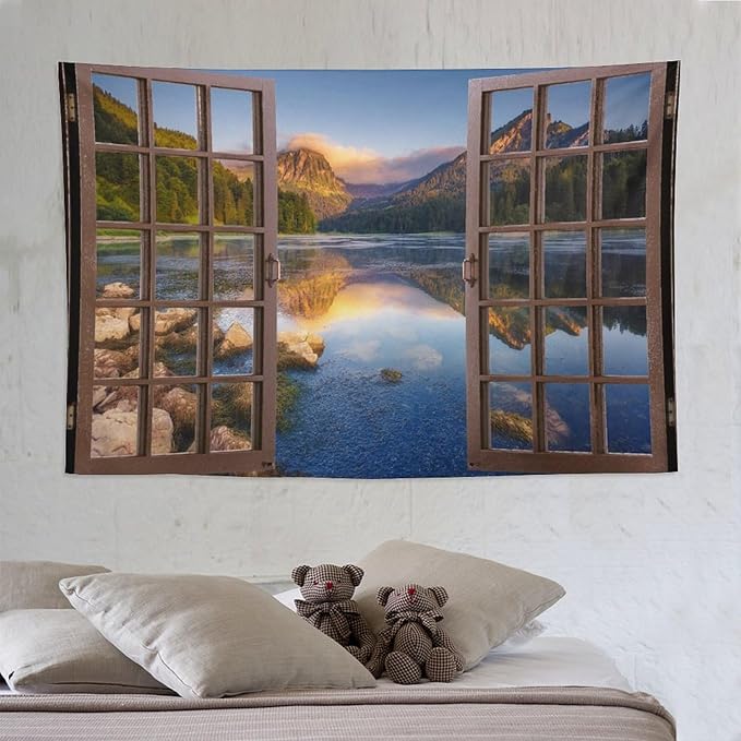 ZhiRain Mountain Scenery Tapestry Wall Hanging Wooden Window View Beautiful Lake Landscape Tapestries Home Decor for Living Room Bedroom Apartment Farmhouse Dorm 60"x90"