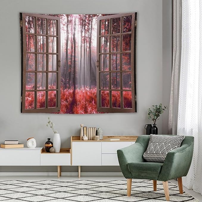 ZhiRain Red Forest Tapestry Wall Hanging Season Foggy Nature And Enchanted Woods Wild Trees Print Tapestries Home Decor for Living Room Bedroom Apartment Farmhouse Dorm 50"x60"