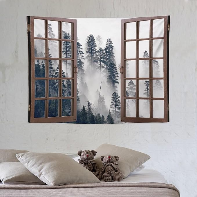 ZhiRain Misty Forest Landscape Tapestry Wall Hanging Wooden Window Forest Mountain Tree Scenery Tapestries Home Decor for Living Room Bedroom Apartment Farmhouse Dorm 30"x40"