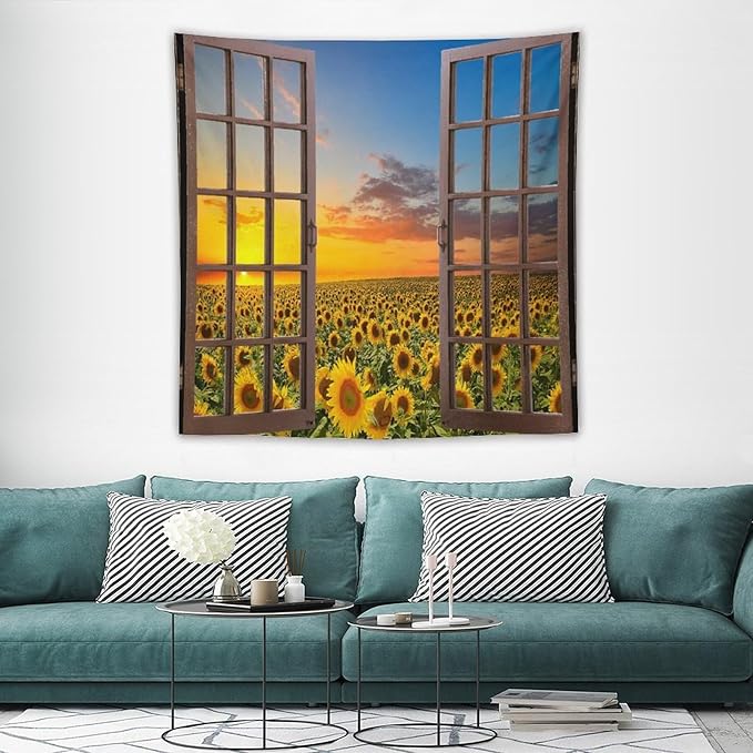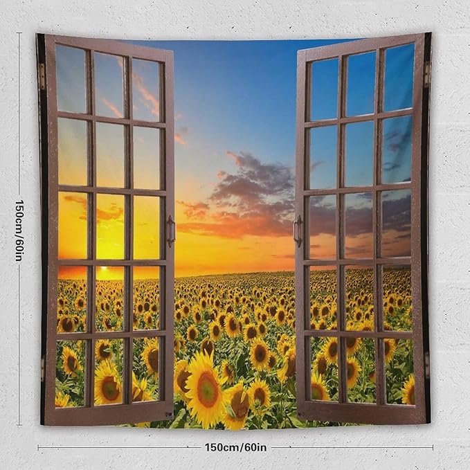 ZhiRain Sunflowers Scenery Tapestry Wall Hanging Through The Window Fields Sunset Landscape Tapestries Home Decor for Living Room Bedroom Apartment Farmhouse Dorm 60"x60"