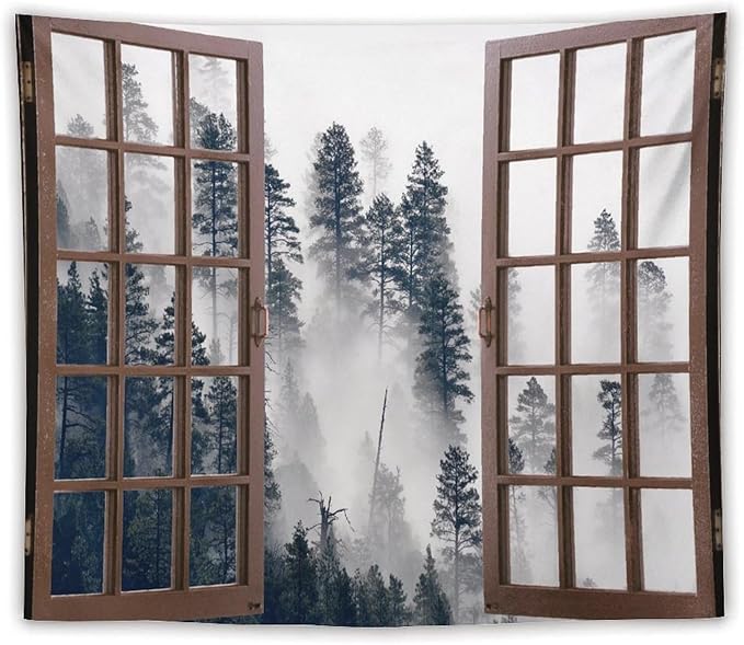 ZhiRain Misty Forest Landscape Tapestry Wall Hanging Wooden Window Forest Mountain Tree Scenery Tapestries Home Decor for Living Room Bedroom Apartment Farmhouse Dorm 50"x60"