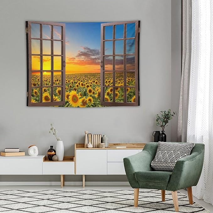 ZhiRain Sunflowers Scenery Tapestry Wall Hanging Through The Window Fields Sunset Landscape Tapestries Home Decor for Living Room Bedroom Apartment Farmhouse Dorm 30"x40"