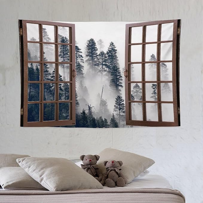 ZhiRain Misty Forest Landscape Tapestry Wall Hanging Wooden Window Forest Mountain Tree Scenery Tapestries Home Decor for Living Room Bedroom Apartment Farmhouse Dorm 40"x60"