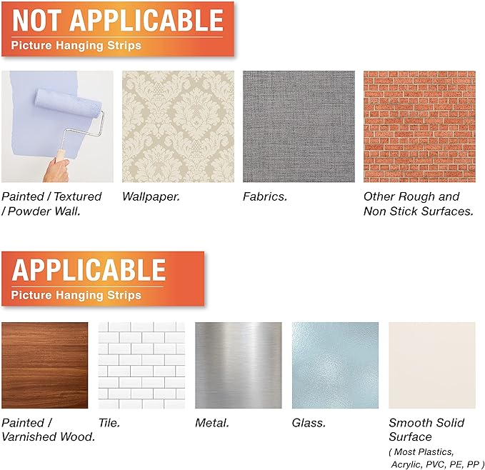 - Versatile: Picture hanging strips can be used for most smooth surfaces, like glass, tile, metal, finished wood (painted or varnished shiplap, cabinets, or doors), painted concrete cinder block, laminates etc. Do not recommend to use on painted walls