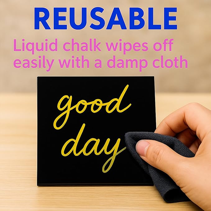 - Reusable & Easy to Write/Wipe: 10pcs 3.9 x 3.9 inch black acrylic signs erasable surface allows repeated use effortlessly, 7 colors of water-based chalk and equipped with cleaning rag. Water-based chalk can be wiped off with a wet rag