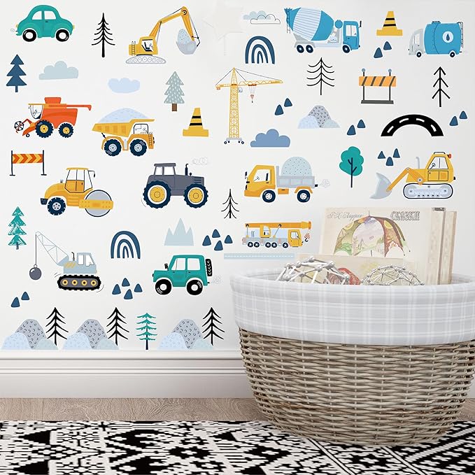 - 90-Piece Construction Vehicle Decals: Includes kids' favorite vehicles like excavators, dump trucks, cement mixers, bulldozers, and cranes, perfect for creating a playful construction theme.