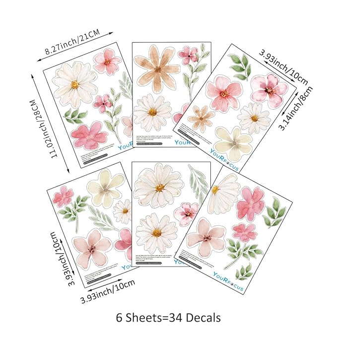 YouRfocus Daisy Watercolor Wall Decals | 34 PCS Boho Flower Stickers for Girls' Rooms, Playrooms, and Nurseries | Dual Layer Print for High Coverage | Removable Peel and Stick Wall Decor | 6 Sheets