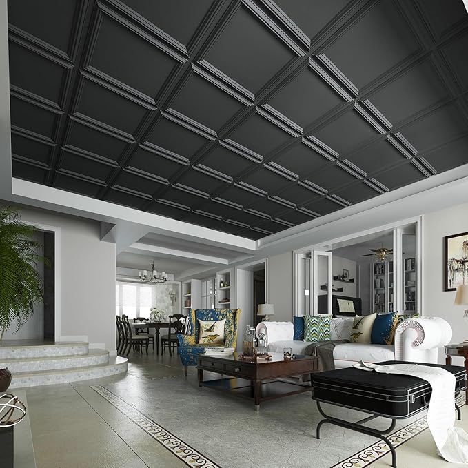 Art3d 12-Pack Drop Relief Ceiling Tiles for Home, Office & Commercial Space, 24 x 24in PVC Waterproof 3D Wall Panels Cover 48 Sq. Ft, Black
