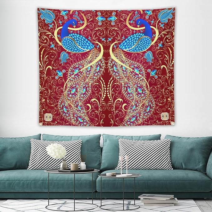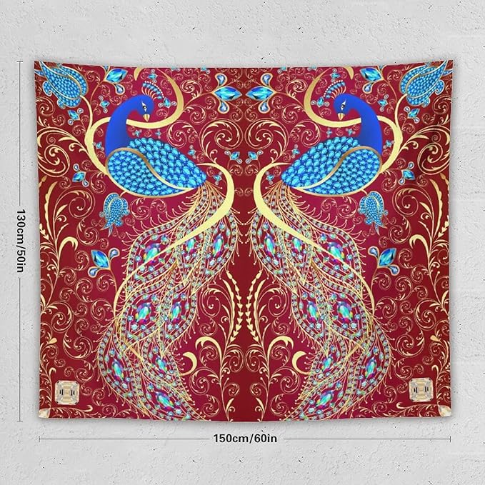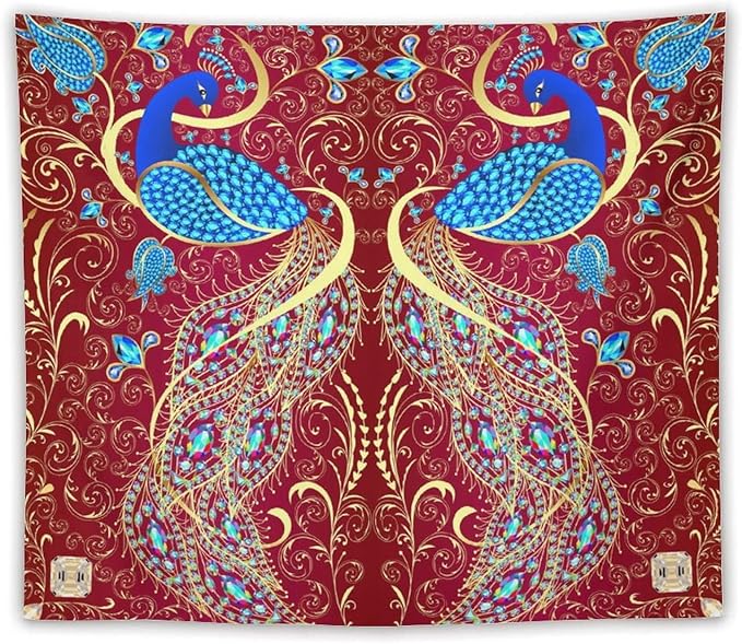ZhiRain Peacock Ornament Tapestry Wall Hanging Golden Red Background Elegant Bohemian Style Tapestries Home Decor for Living Room Bedroom Farmhouse Apartment Dorm 50"x60"