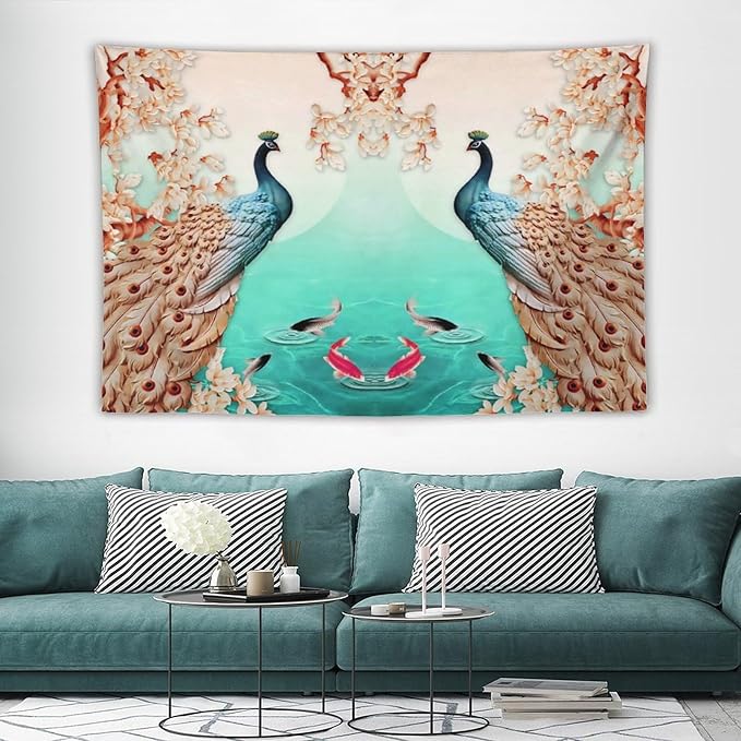 ZhiRain Peacock Tapestry Wall Hanging Retro Floral Elegant Vintage Feather Flower Theme Koi Fish Tapestries Home Decor for Living Room Bedroom Farmhouse Apartment Dorm 40"x60"