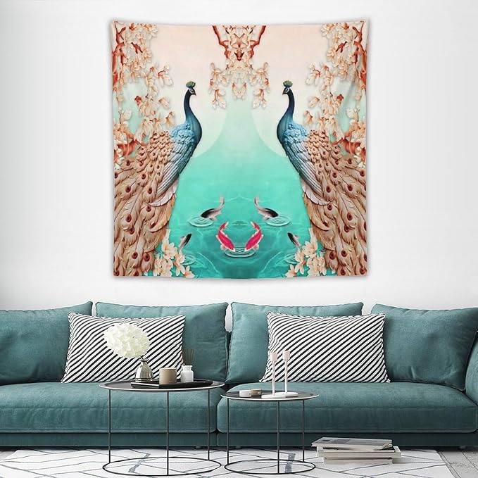 ZhiRain Peacock Tapestry Wall Hanging Retro Floral Elegant Vintage Feather Flower Theme Koi Fish Tapestries Home Decor for Living Room Bedroom Farmhouse Apartment Dorm 60"x60"
